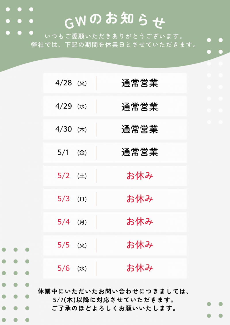 ゴールデンウィーク休業のお知らせ
